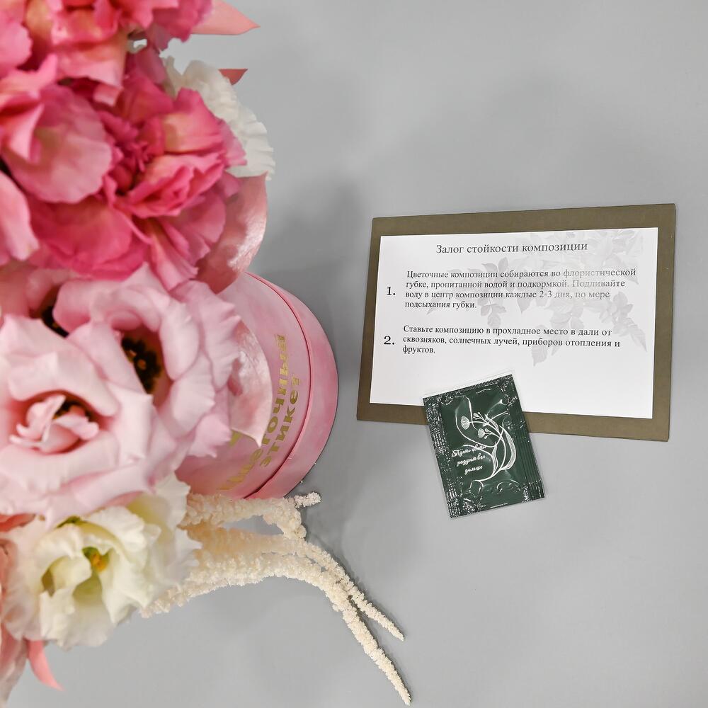 Нежная композиция в розовой цветовой гамме.В составе французские розы, орхидея цимбидиум, пионовидная роза, похожая на пион, лизиантус и стабилизированный амарант.Флористы студии Цветочный Этикет собрали её из самых свежих цветов, тщательно продумав состав. Композиция … Показать ещёготова удивлять красотой своего получателя! С композицией вы получите конверт с открыткой, в которой мы напишем любое пожелание, инструкцию свежести и средство для продления жизни срезанных цветов.